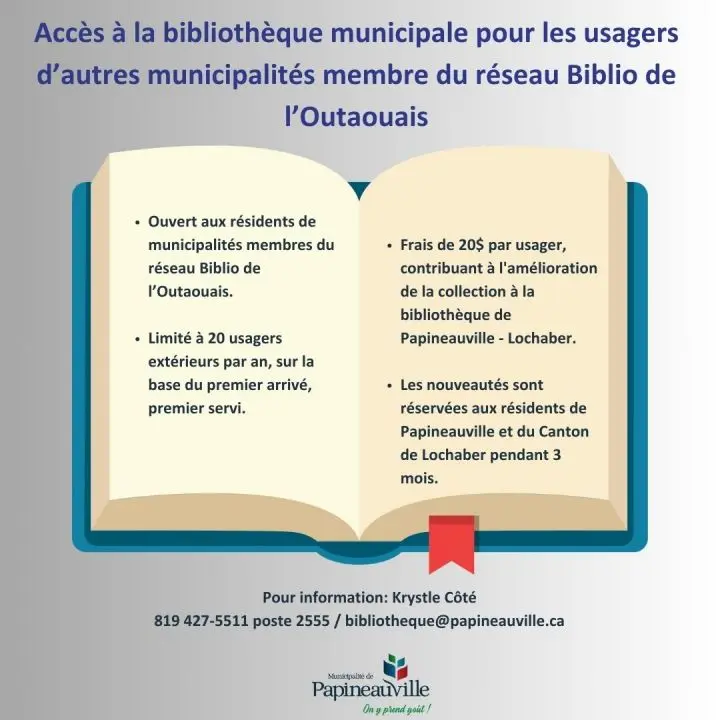 Pour plus d’informations et pour vous inscrire, contactez Krystle Côté au 819-427-5511 poste 2555 ou par courriel à bibliotheque@papineauville.ca.