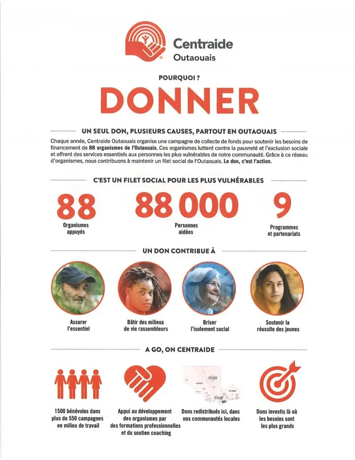 Chaque année, Centraide Outaouais organise une campagne de collecte de fonds pour soutenir les besoins de financement de 88 organismes de l’Outaouais.