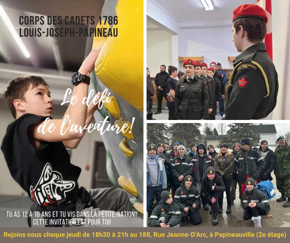 Nous offrons du biathlon, tir à la carabine à air comprimé, sports, expéditions en forêt, escalade, canot, leadership, musique, bref de tout pour tous les goûts! Venez nous rencontrer lors de nos soirées d’instruction, les jeudis soirs de 18h30 à 21h00, à Papineauville! Il nous fera plaisir de discuter avec vous et de vous fournir de plus amples renseignements.